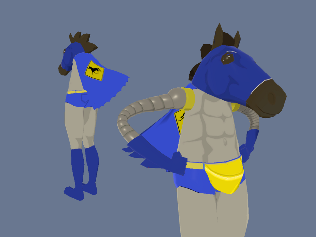 Sporting horseshoe sandals, short cut jeans, and fannypack/bumbag, the reverse-centaur has the lower body of a man & the head of a horse.